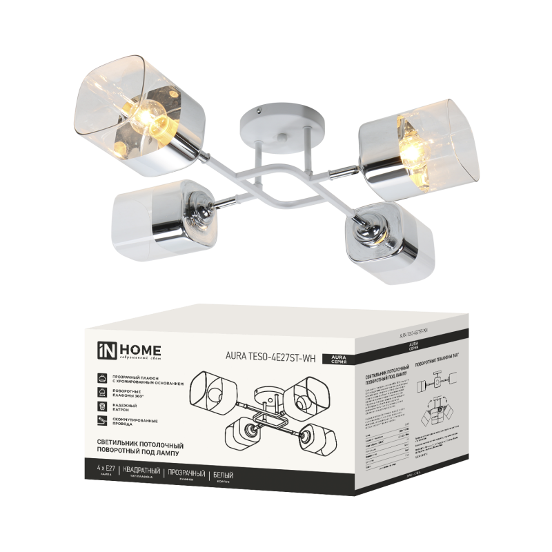 IN HOME Люстра поворотная под лампу AURA TESO-4E27ST-WH 4хЕ27 прозрачные плафоны, белый корпус 4Р0007
