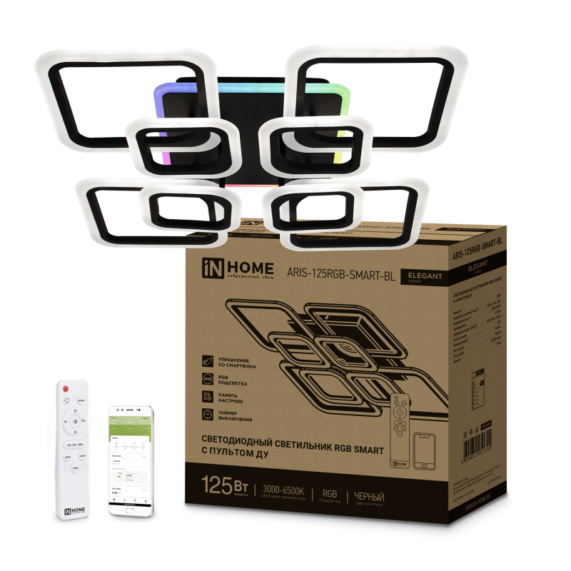 IN HOME Светильник светодиодный ELEGANT ARIS-125RGB-SMART-BL 125Вт 230В 3000-6500K 8800Лм 585х585х115мм пульт ДУчерный