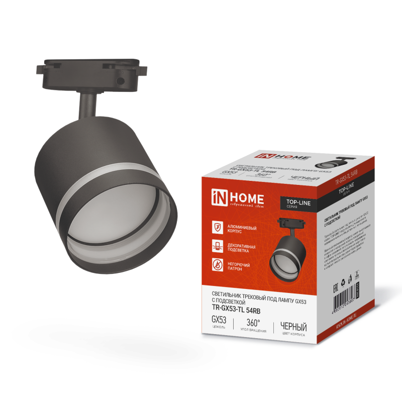 IN HOME Светильник трековый TR-GX53-TL 54RB под лампу GX53 с подсветкой черный