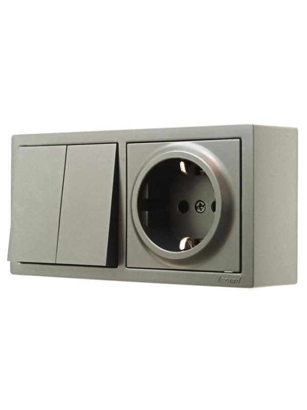 Lezard LETO Выключатель двойной и розетка с/з, платина горизонталь